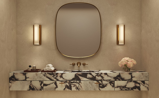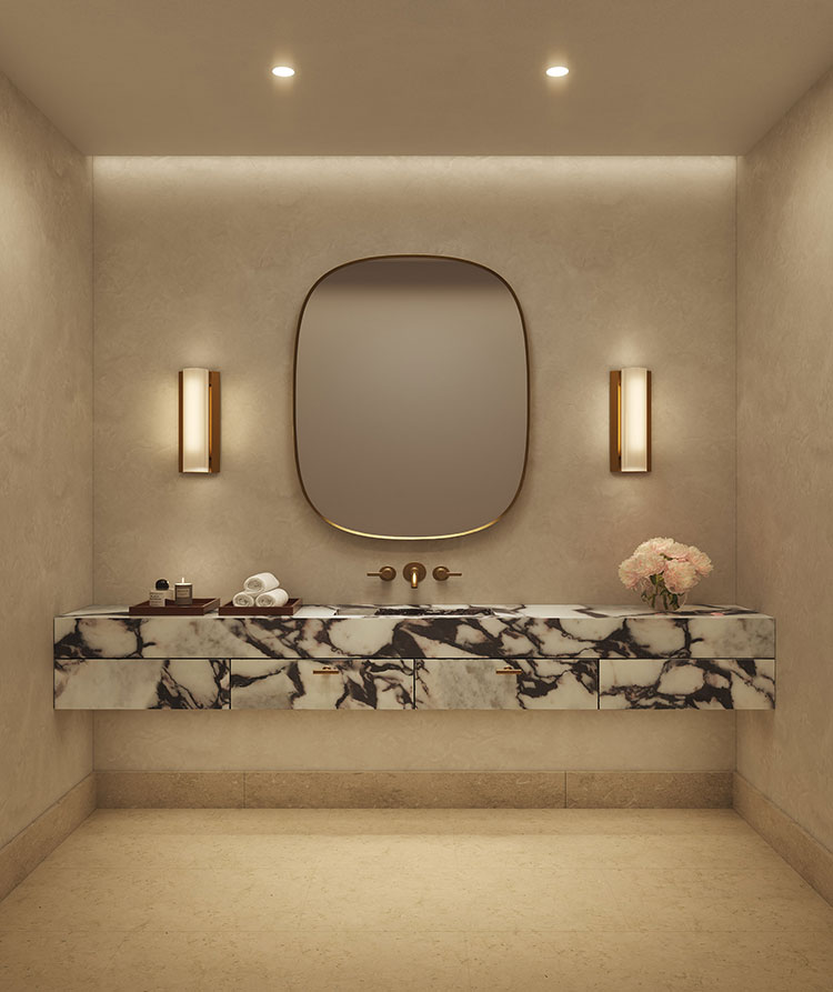 - Custom stone-clad vanity with stone-clad drawers and brass faucet