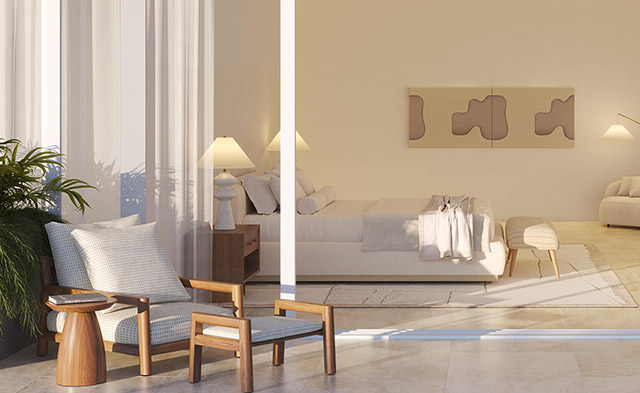 Custom-designed furnishings and soft, natural tones create spacious, light-filled sanctuaries. These rooms include generous dressing areas and en-suite baths with thoughtful touches.